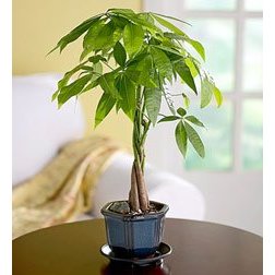 Approx 10 inches tall, this braided money tree comes in a glazed bonsai pot. Great for home or office. Brings good luck to you. Braided trunk makes this a neat piece. Low care. Does not need alot of sun nor water.